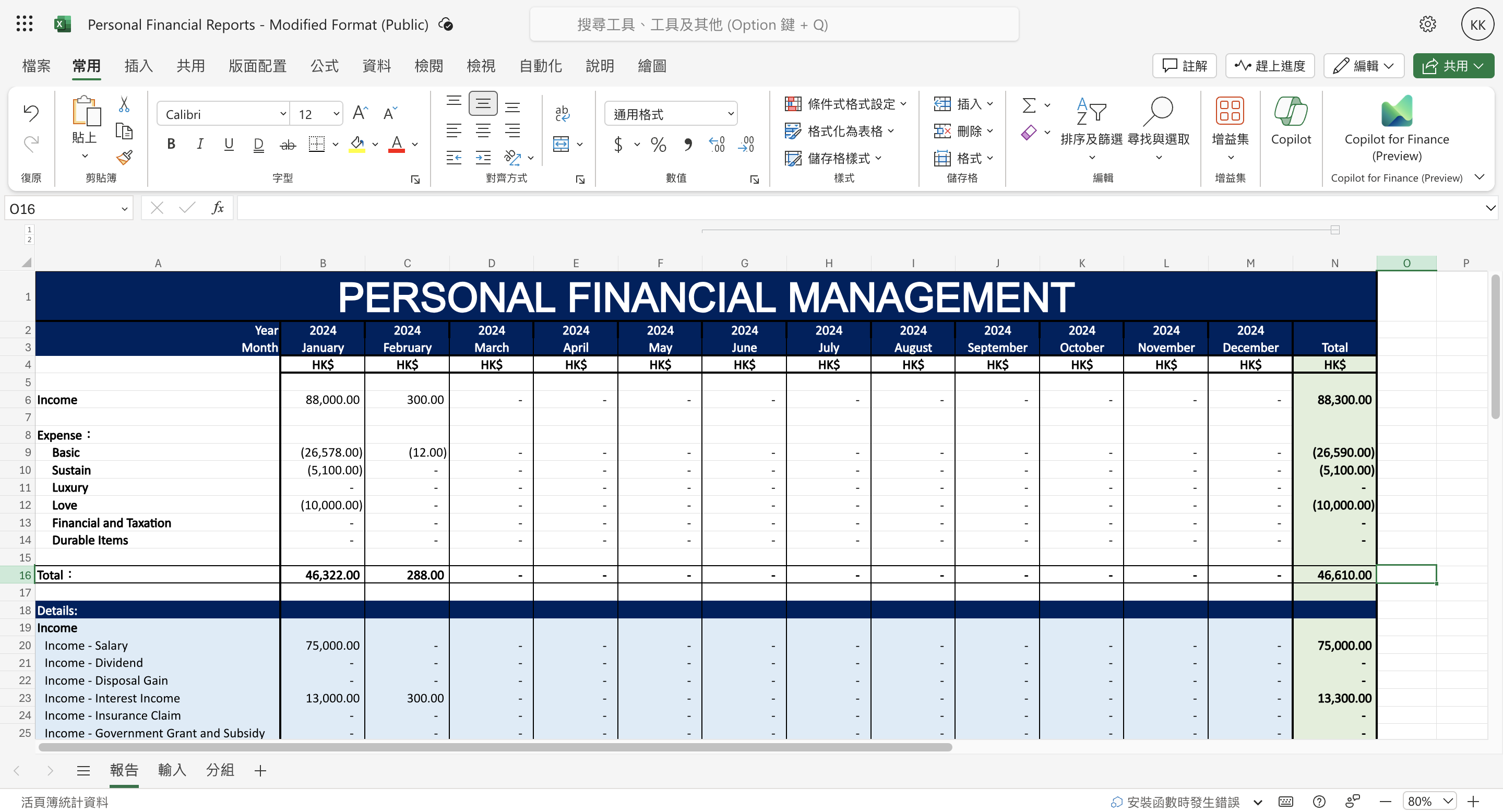 報告:在這裡,您可以查看交易的摘要和分析,例如收入和支出明細、現金流量表、凈資產和預算差異。您可以使用圖表、表格和條件格式來視覺化資料並突出顯示重要資訊。
