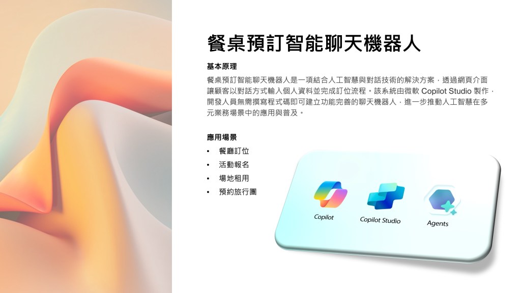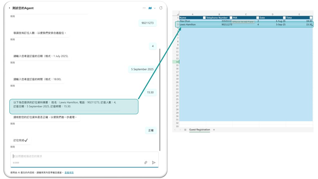 於是,我踏上了一場創作之旅:運用 COPILOT STUDIO、POWER AUTOMATE 與 EXCEL,親手打造出自己的第一個 AI Agent。這個 AI Agent 的原始模型是用來協助餐廳訂位。顧客只需透過特製的聊天機器人輸入預訂資訊,AI Agent 就會自動啟動,將資訊經由 POWER AUTOMATE 傳送至 EXCEL 表格,資料即時更新,餐廳管理者便能立即在資訊表上獲取與跟進最新訂位情況。