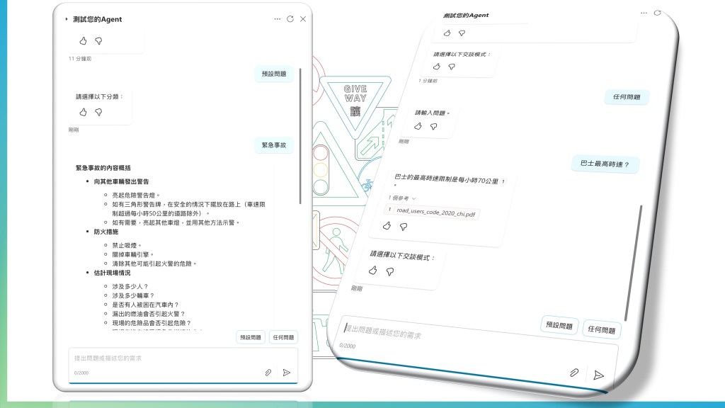 - 若你有交通規則的 PDF、Word 文件或網頁連結,可以將它們作為知識來源(Knowledge base)導入,讓 chatbot 能根據內容回答問題。