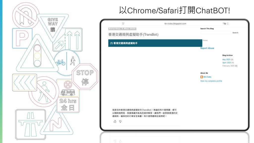 無論你是司機、行人、單車騎士,還是推手推車的使用者,作為道路的一分子,了解交通規則至關重要。然而,現行法例只要求司機考取牌照,許多其他道路使用者可能從未正式學習過交通規則,而司機在考牌後也可能遺忘部分內容。因此,這個香港交通規例虛擬助手正是你的好幫手!只需輸入問題,它便能透過人工智能技術迅速提供準確答案,幫助你更安心、安全地使用道路。